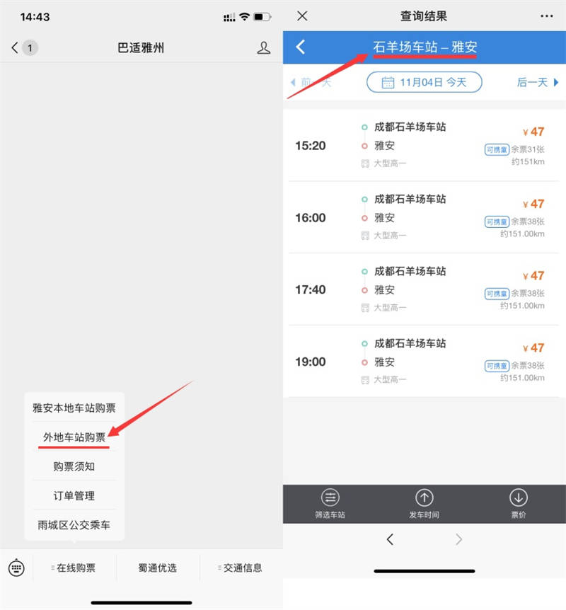 11月4日,蜀通公司線上購(gòu)票平臺(tái)“巴適雅州”微信公眾號(hào)開(kāi)通省內(nèi)外多地區(qū)汽車購(gòu)票業(yè)務(wù)。