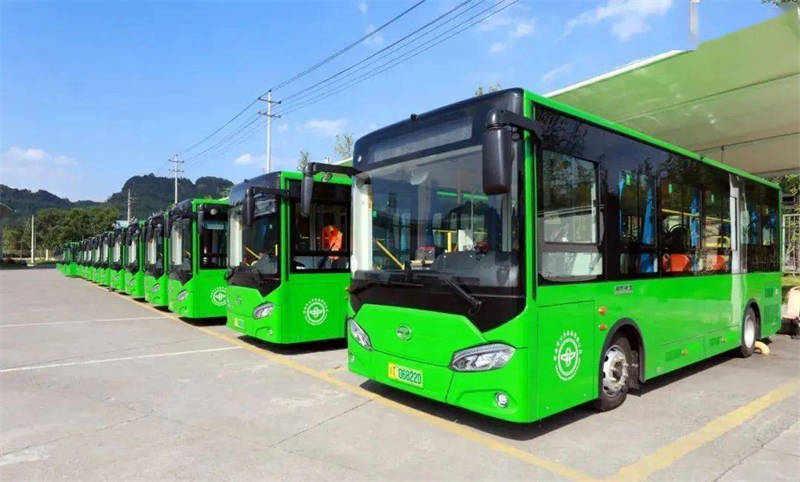 煥然一新的綠色新能源電動公交車列裝上線運(yùn)營