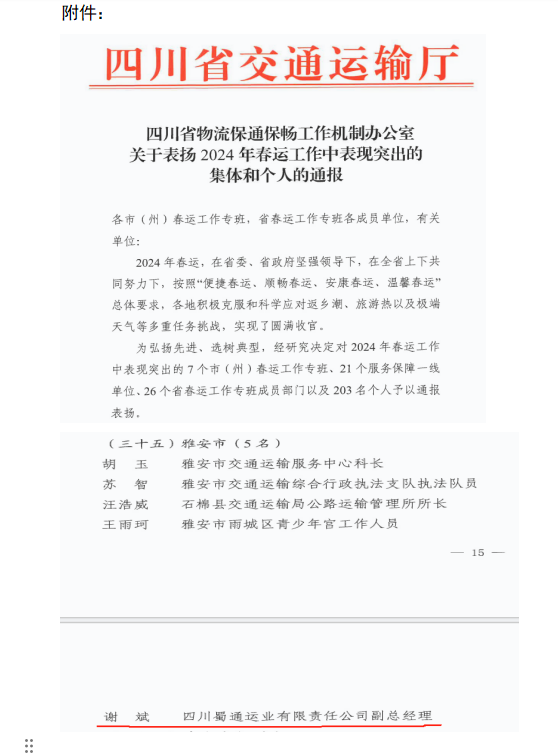 展企業(yè)形象 樹行業(yè)典范 交建集團(tuán)蜀通公司獲四川省交通運(yùn)輸廳2024年春運(yùn)工作表現(xiàn)突出通報(bào)表揚(yáng)