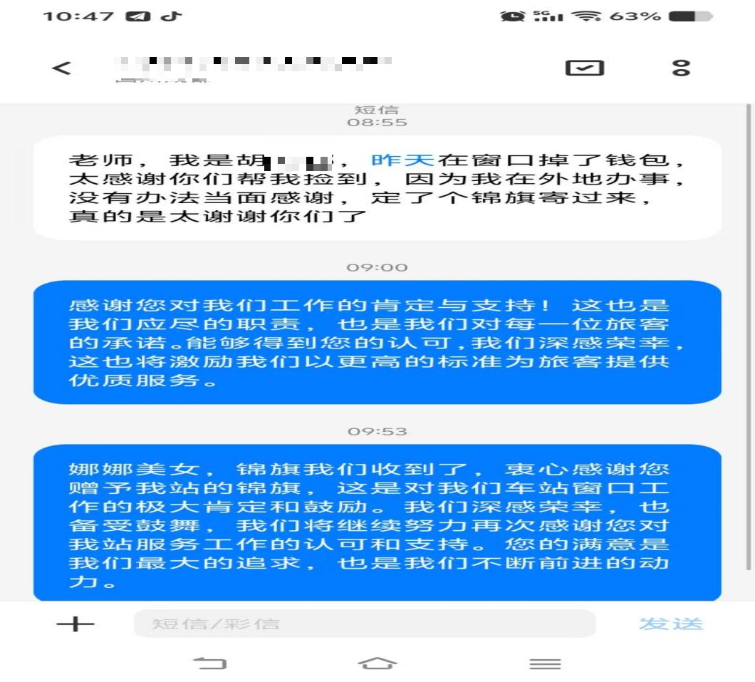5月14日11時(shí)11分,售票員郝凌云發(fā)現(xiàn)柜臺(tái)上遺留了一個(gè)卡包,內(nèi)有現(xiàn)金 300 元、多張銀行卡、身份證及社?ǖ戎匾锲。郝凌云第一時(shí)間上報(bào)值班科長(zhǎng),通過(guò)站務(wù)系統(tǒng)比對(duì)購(gòu)票信息,僅用5分鐘便鎖定失主為即將前往漢源的旅客胡女士,此時(shí)胡女士正在等待檢票,尚未察覺錢包丟失。值班站長(zhǎng)通過(guò)廣播系統(tǒng)緊急尋人,胡女士聽到廣播后立即前往值班室認(rèn)領(lǐng)物品,經(jīng)值班科長(zhǎng)仔細(xì)核對(duì)身份及物品信息后,將卡包完好歸還。胡女士激動(dòng)致謝:“太感謝你了!你們汽車站的工作人員素質(zhì)真高,太讓人暖心了!”