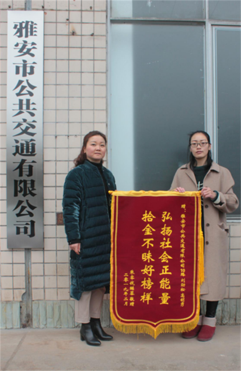 “請一定把我們的感謝帶給駕駛員和發(fā)班員!2月14日下午17時15分左右,一名手拿寫著“拾金不昧好榜樣弘揚社會正能量”錦旗的市民錢續(xù)露來到雅安市公共交通有限公司,將錦旗送到了經(jīng)理助理方媛手上,請她把感謝之意轉達給10路公交車駕駛員劉進松和發(fā)班員高胡秀。
