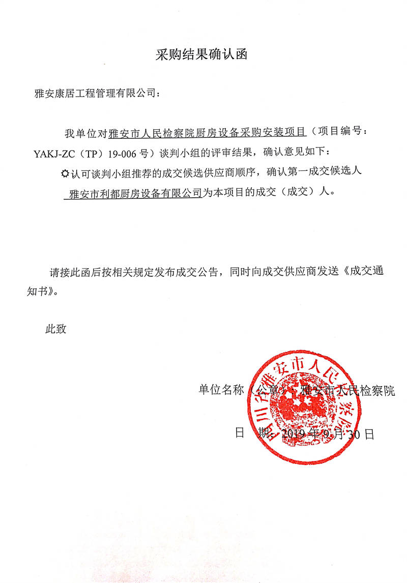 雅安市人民檢察院廚房設(shè)備采購(gòu)安裝項(xiàng)目采購(gòu)結(jié)果公示