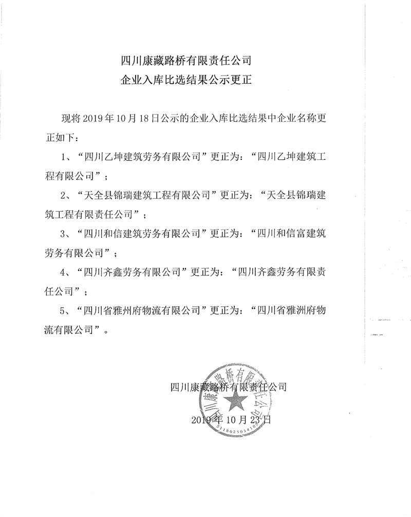 四川康藏路橋有限責任公司企業(yè)入庫比選結(jié)果公示更正