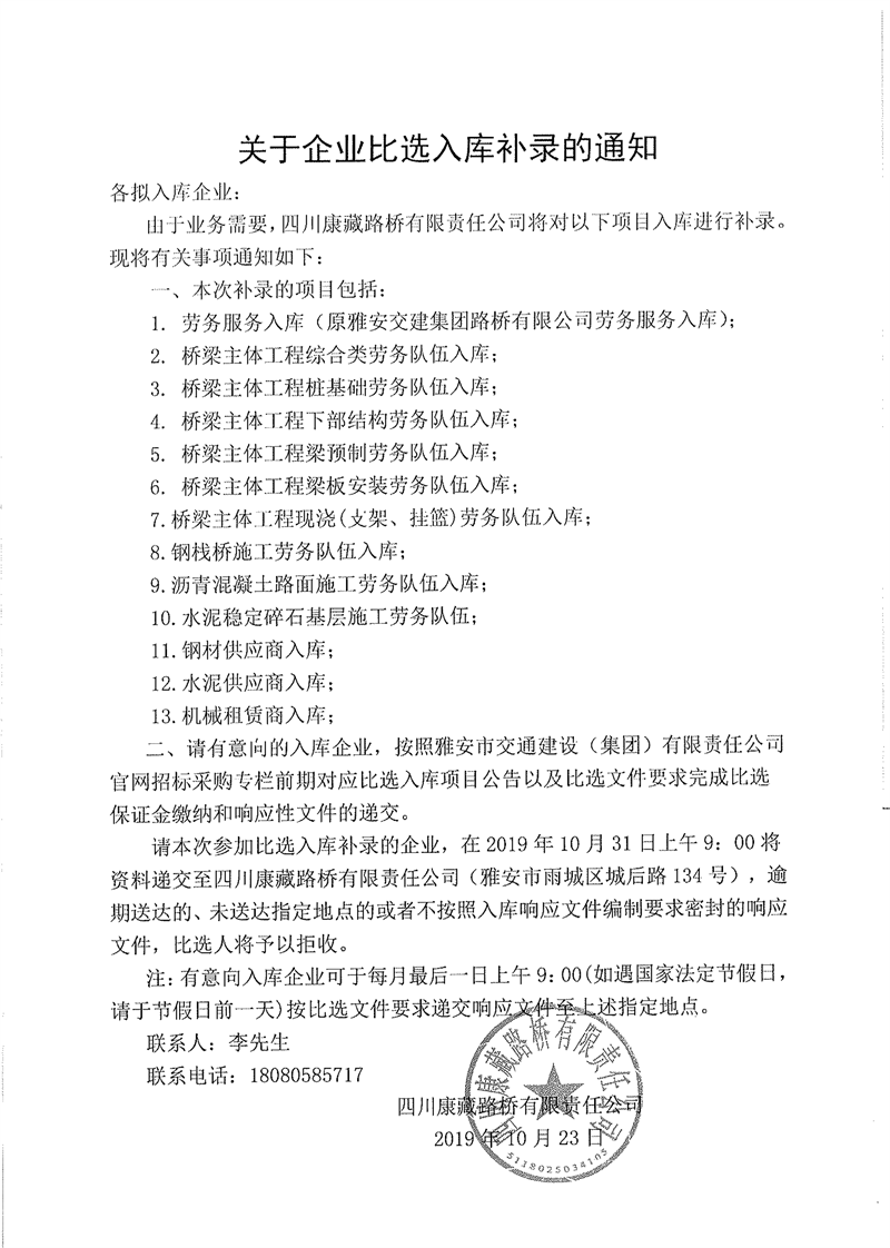四川康藏路橋有限責(zé)任公司關(guān)于企業(yè)比選入庫(kù)補(bǔ)錄的通知