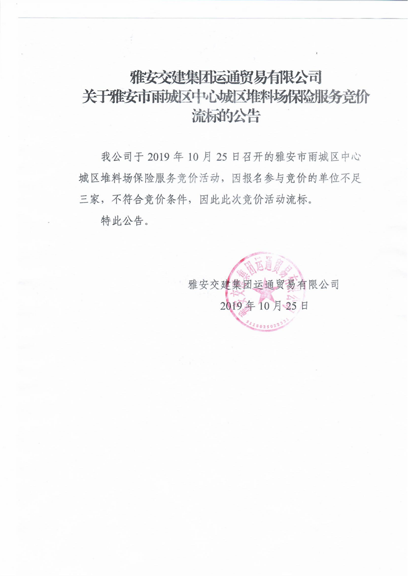 雅安交建集團運通貿(mào)易有限公司關(guān)于雅安市雨城區(qū)中心城區(qū)堆料場保險服務(wù)競價流標的公告