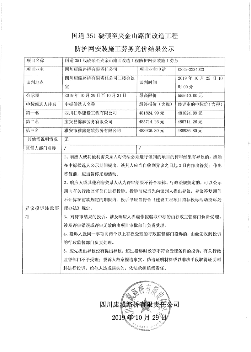 四川康藏路橋有限責(zé)任公司國道351磽磧至夾金山路面改造工程防護網(wǎng)安裝施工勞務(wù)競價結(jié)果公示