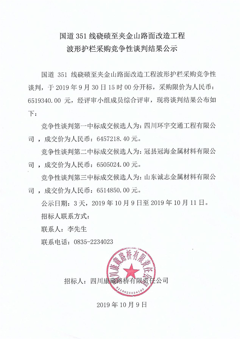 四川康藏路橋有限責任公司國道351線磽磧至夾金山路面改造工程波形護欄采購競爭性談判結果公示
