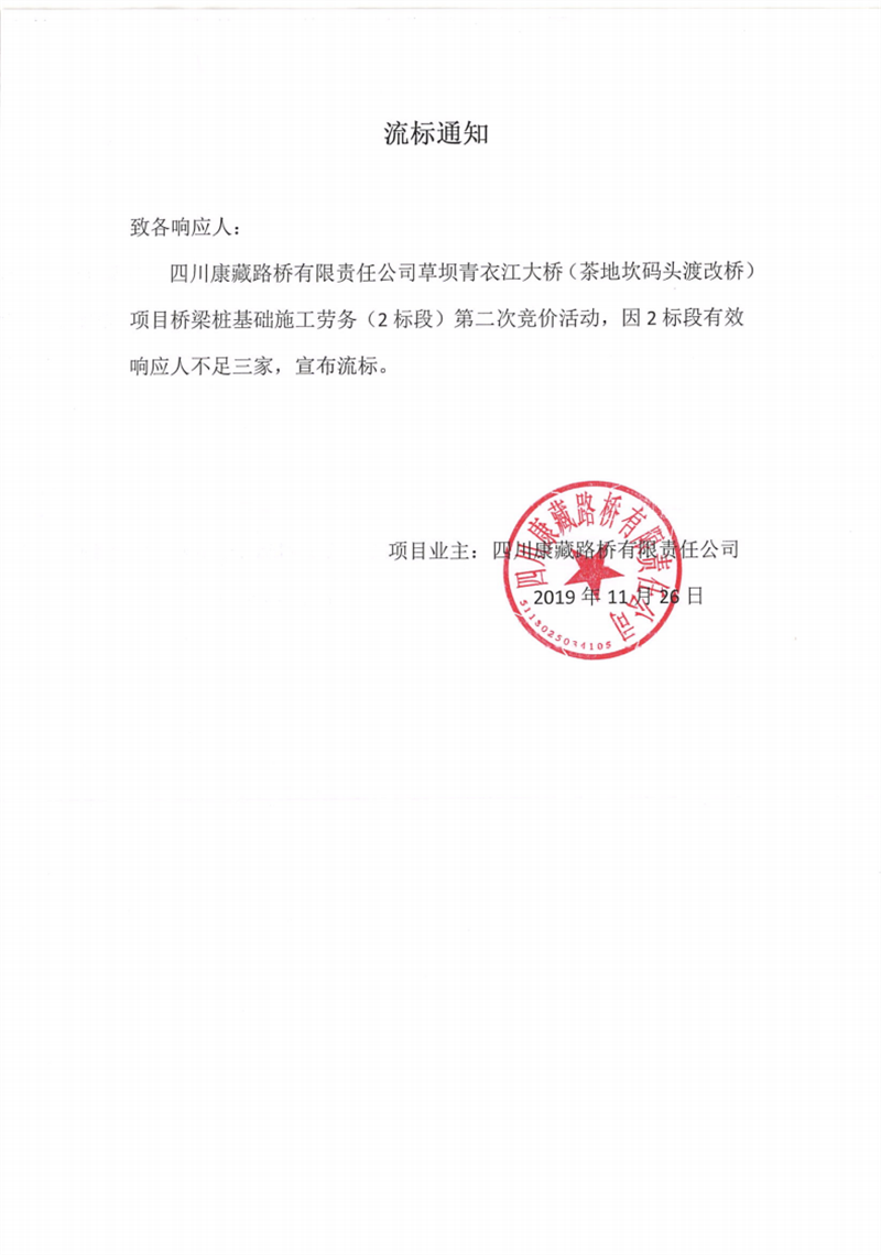 四川康藏路橋有限責(zé)任公司草壩青衣江大橋(茶地坎碼頭渡改橋)項(xiàng)目橋梁樁基礎(chǔ)(2標(biāo)段)施工勞務(wù)競(jìng)價(jià)(第二次)流標(biāo)通知