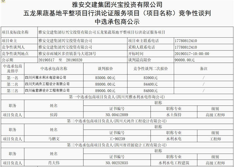 雅安交建集團興寶投資有限公司五龍果蔬基地平整項目行洪論證服務(wù)項目(項目名稱)競爭性談判 中選承包商公示