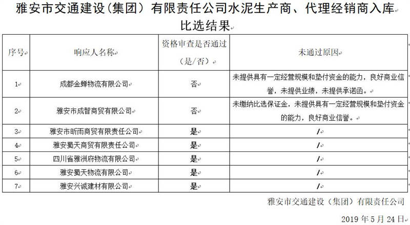 雅安市交通建設(集團)有限責任公司水泥生產(chǎn)商、代理經(jīng)銷商入庫比選結果公示