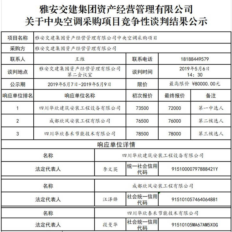 雅安交建集團資產(chǎn)經(jīng)營管理有限公司 關于中央空調采購項目競爭性談判結果公示
