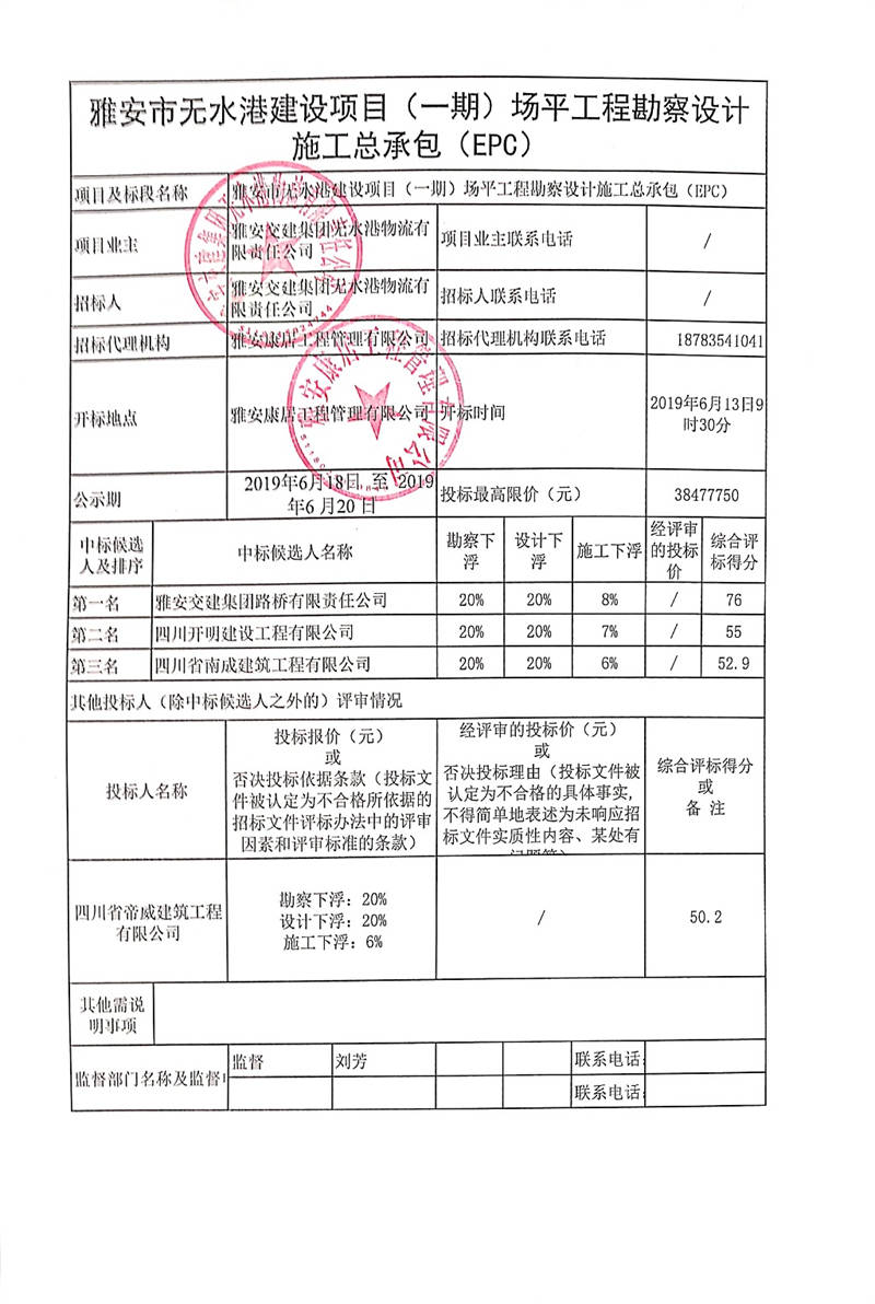 雅安市無水港建設(shè)項目(一期)場平工程勘察設(shè)計施工總承包(EPC)公開招標結(jié)果公示
