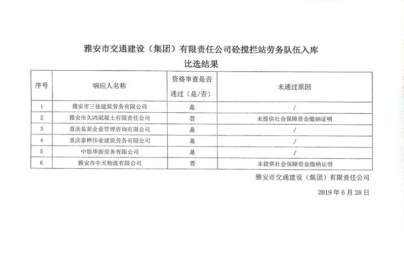 雅安市交通建設(shè)(集團)有限責(zé)任公司砼攪攔站勞務(wù)隊伍入庫比選結(jié)果