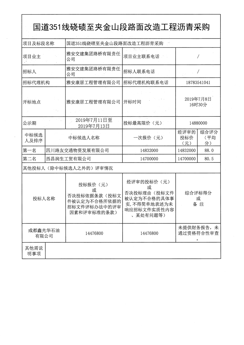雅安交建集團(tuán)路橋有限責(zé)任公司國(guó)道351線(xiàn)磽磧至夾金山段路面改造工程瀝青采購(gòu)公開(kāi)招標(biāo)結(jié)果公示