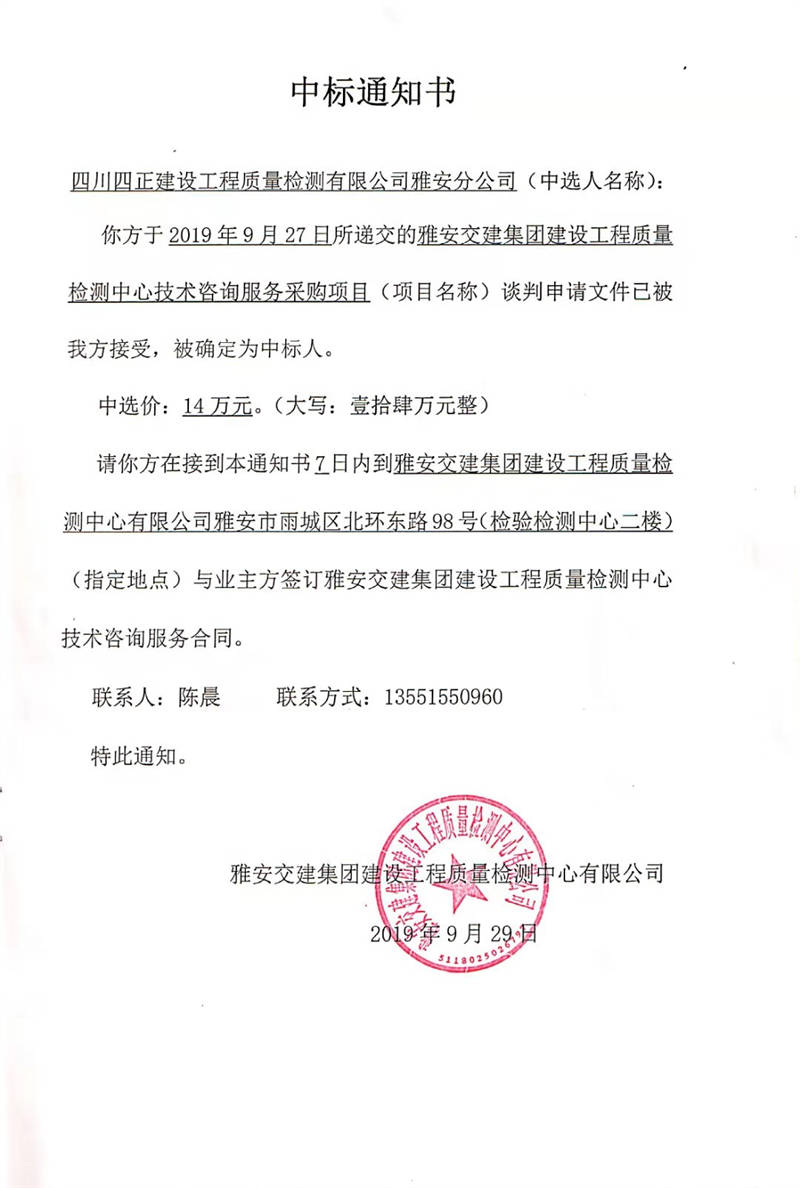 雅安交建集團建設(shè)工程質(zhì)量檢測中心技術(shù)咨詢服務采購項目中標公示