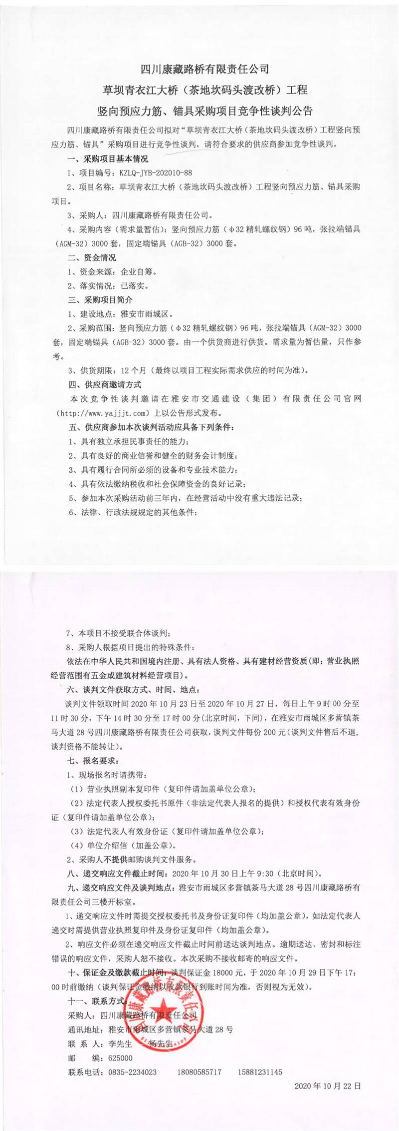 四川康藏路橋有限責(zé)任公司草壩青衣江大橋(茶地坎碼頭渡改橋)工程豎向預(yù)應(yīng)力筋、錨具采購項(xiàng)目競爭性談判公告