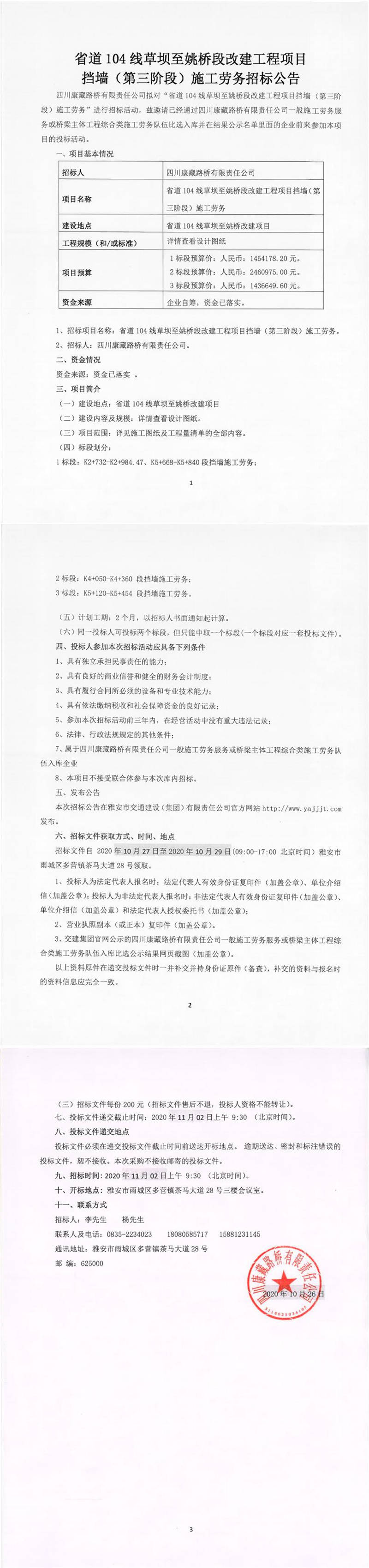 四川康藏路橋有限責任公司省道104線草壩至姚橋段改建工程項目擋墻(第三階段)施工勞務招標公告