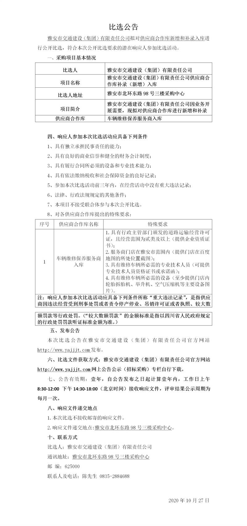 雅安市交通建設(shè)(集團)有限責(zé)任公司供應(yīng)商合作庫補錄(新增)入庫比選公告