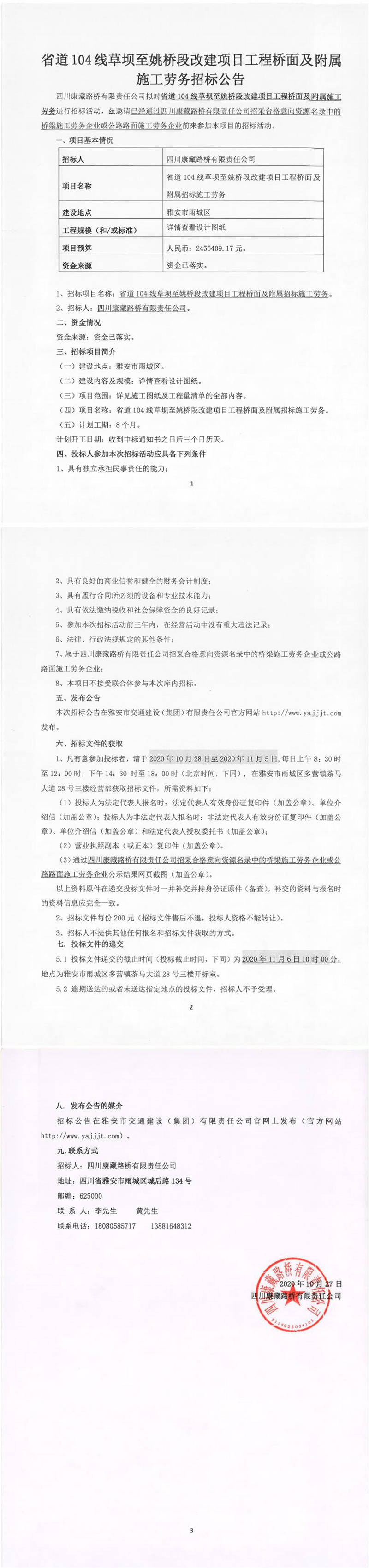 四川康藏路橋有限責(zé)任公司省道104線草壩至姚橋段改建項目工程橋面及附屬施工勞務(wù)招標(biāo)公告