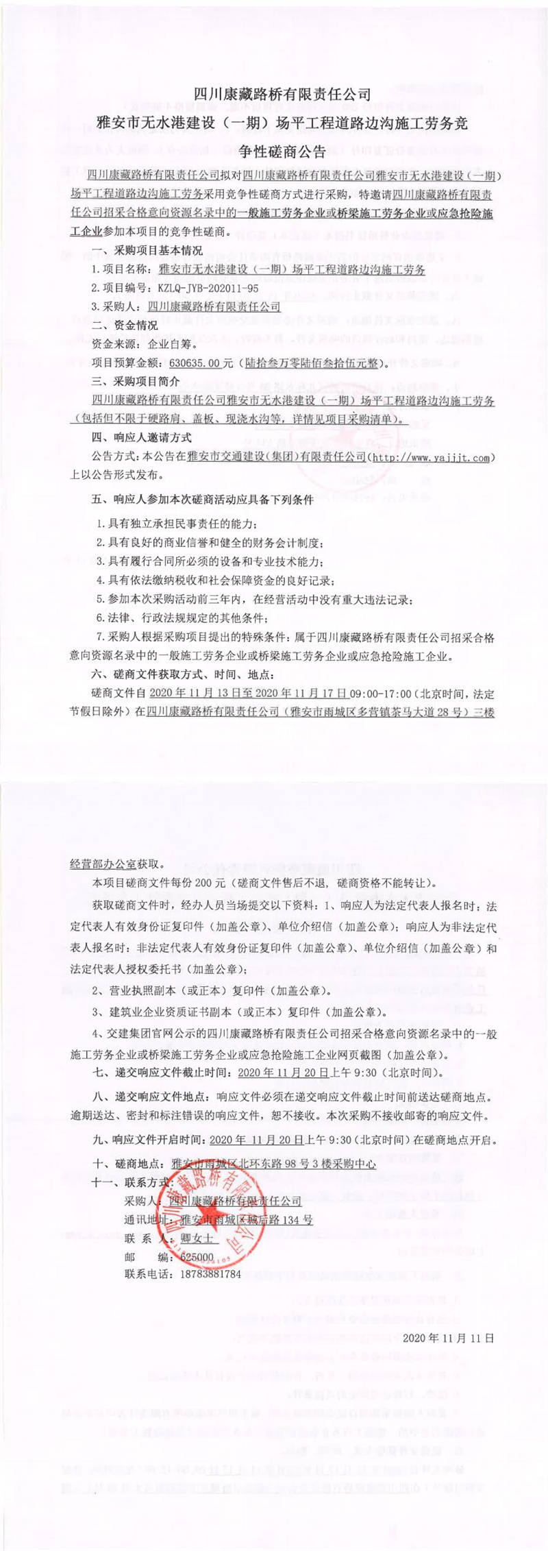 四川康藏路橋有限責(zé)任公司雅安市無水港建設(shè)(一期)場平工程道路邊溝施工勞務(wù)競爭性磋商公告