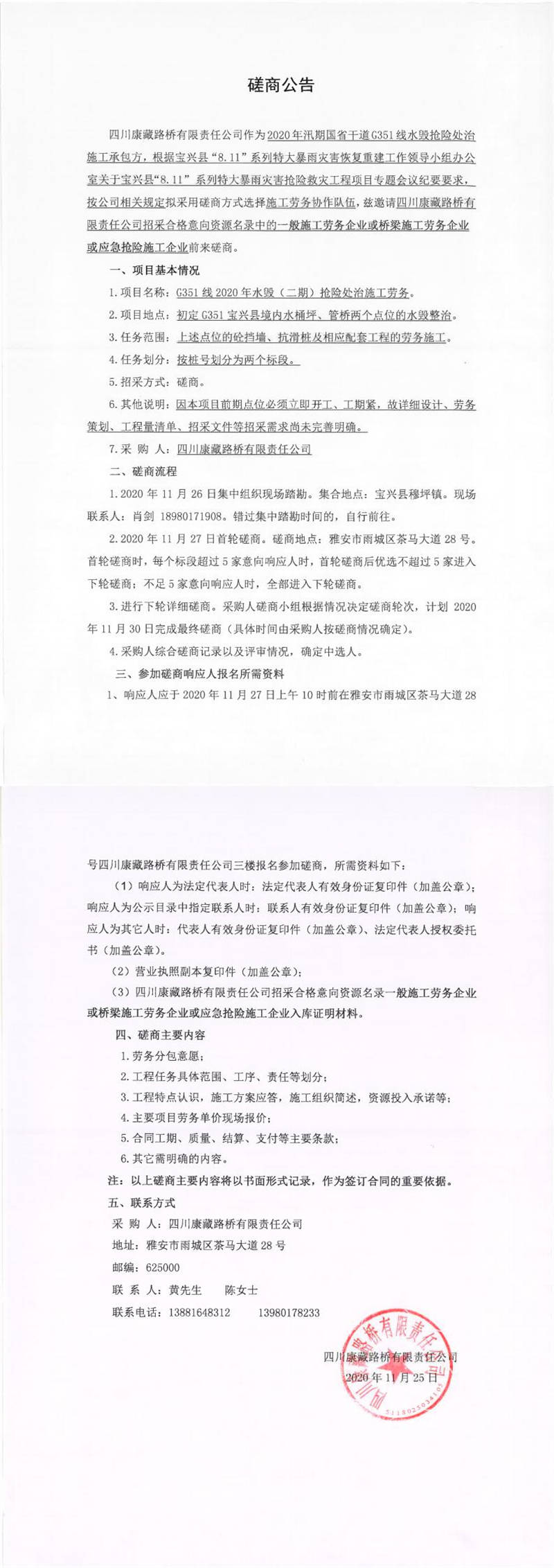 四川康藏路橋有限責(zé)任公司G351線2020年水毀(二期)搶險處治施工勞務(wù)磋商公告