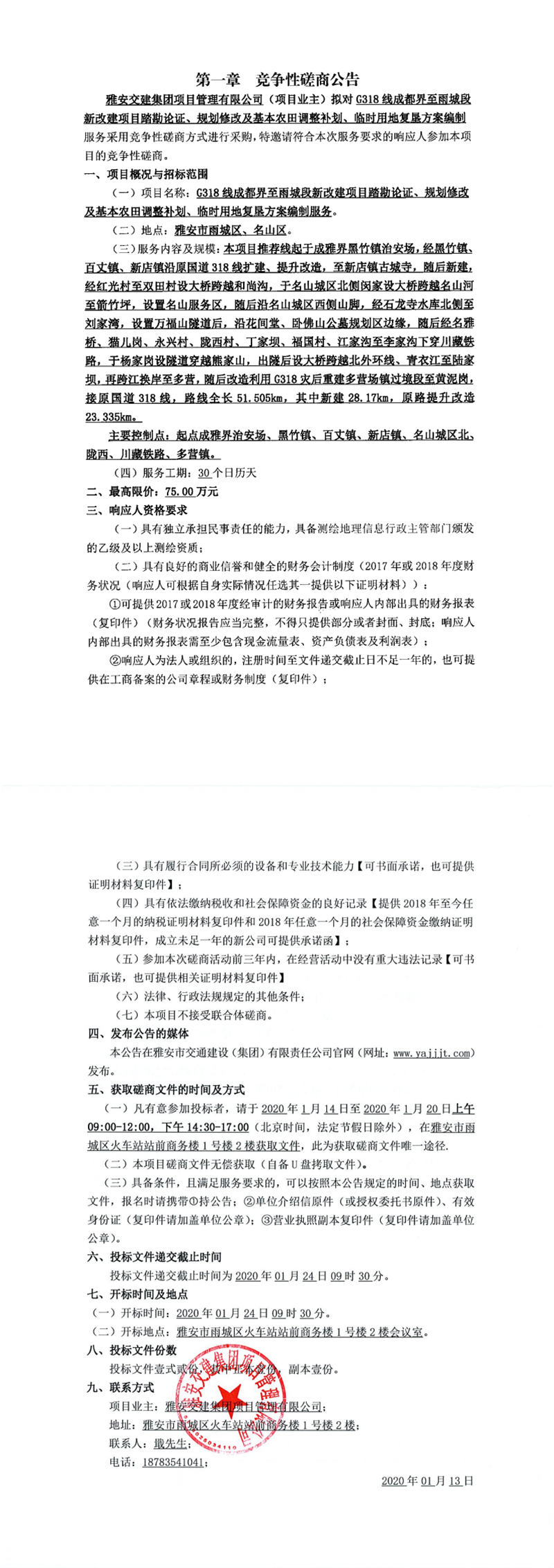 雅安交建集團(tuán)項(xiàng)目管理有限公司G318線成都界至雨城段新改建項(xiàng)目踏勘論證、規(guī)劃修改及基本農(nóng)田調(diào)整補(bǔ)劃、臨地用地復(fù)墾方案編制服務(wù)競(jìng)爭(zhēng)性磋商公告