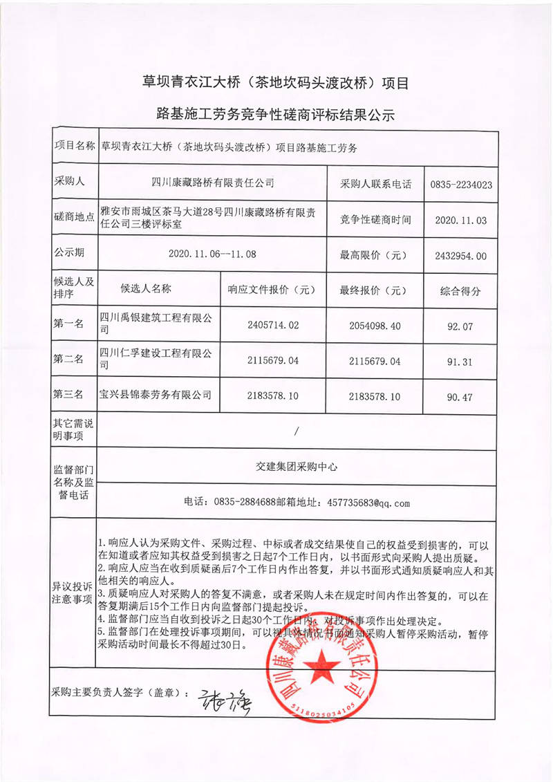 四川康藏路橋有限責(zé)任公司草壩青衣江大橋(茶地坎碼頭渡改橋)項(xiàng)目路基施工勞務(wù)競爭性磋商評(píng)標(biāo)結(jié)果公示
