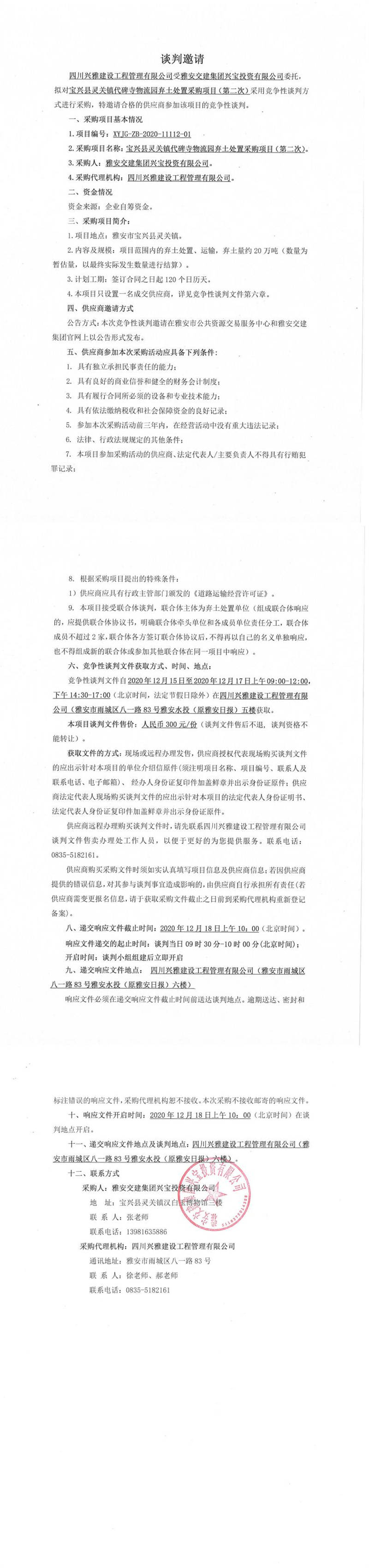 雅安交建集團(tuán)興寶投資有限公司寶興縣靈關(guān)鎮(zhèn)代碑寺物流園棄土處置采購(gòu)項(xiàng)目(第二次)談判公告