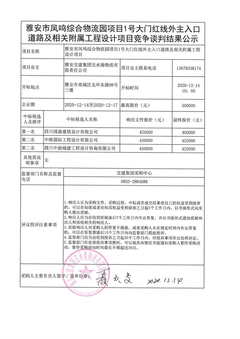 雅安交建集團(tuán)無水港物流有限責(zé)任公司雅安市鳳鳴綜合物流園項(xiàng)目1號大門紅線外主入口道路及相關(guān)附屬工程設(shè)計(jì)項(xiàng)目談判結(jié)果公示