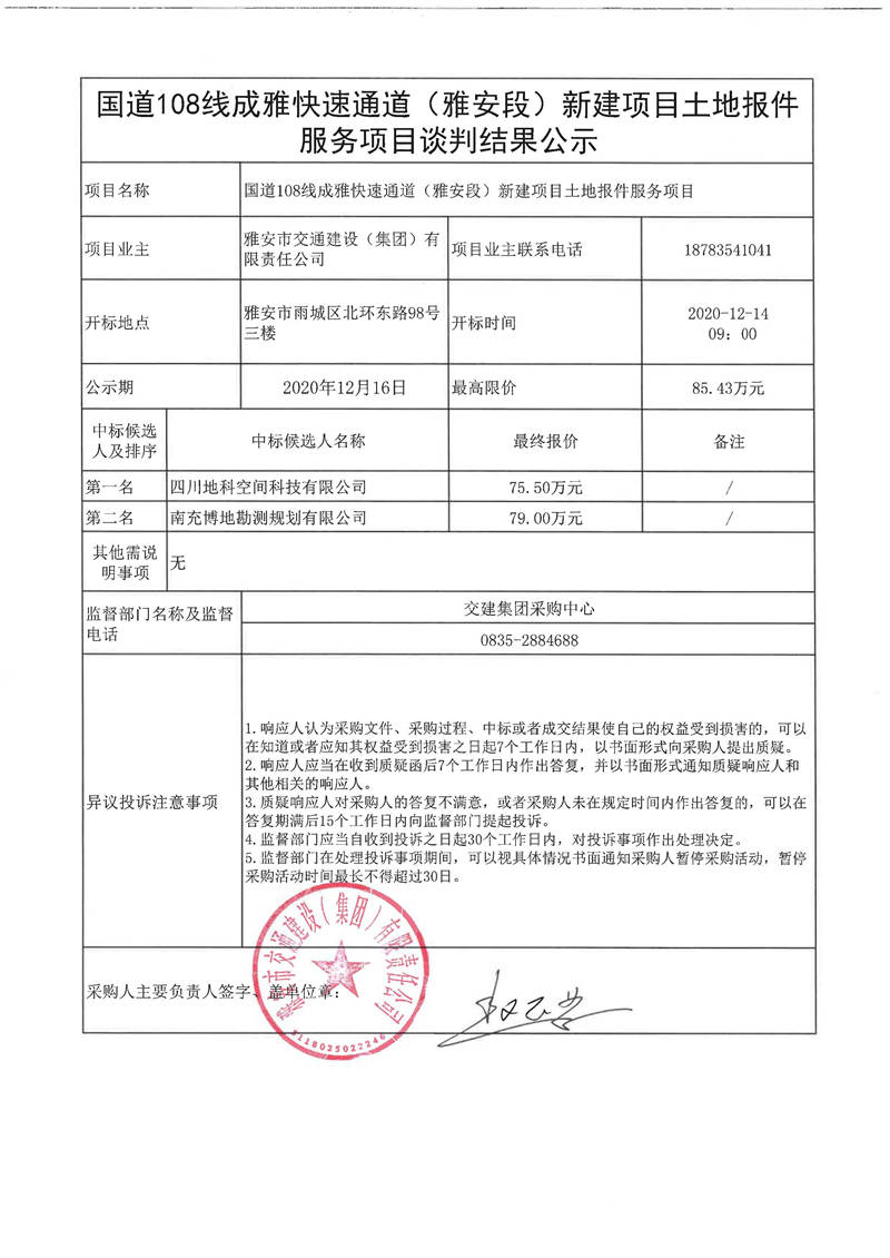 雅安市交通建設(shè)(集團(tuán))有限責(zé)任公司國道108線成雅快速通道(雅安段)新建項目土地報件服務(wù)項目談判結(jié)果公示