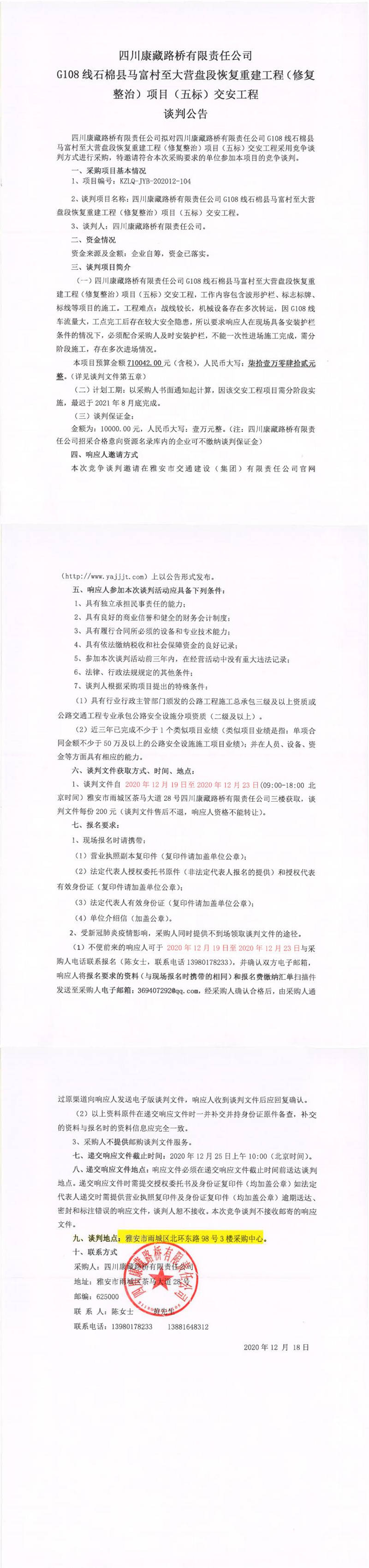 四川康藏路橋有限責(zé)任公司G108線石棉縣馬富村至大營(yíng)盤(pán)段恢復(fù)重建工程(修復(fù)整治)項(xiàng)目(五標(biāo))交安工程談判公告