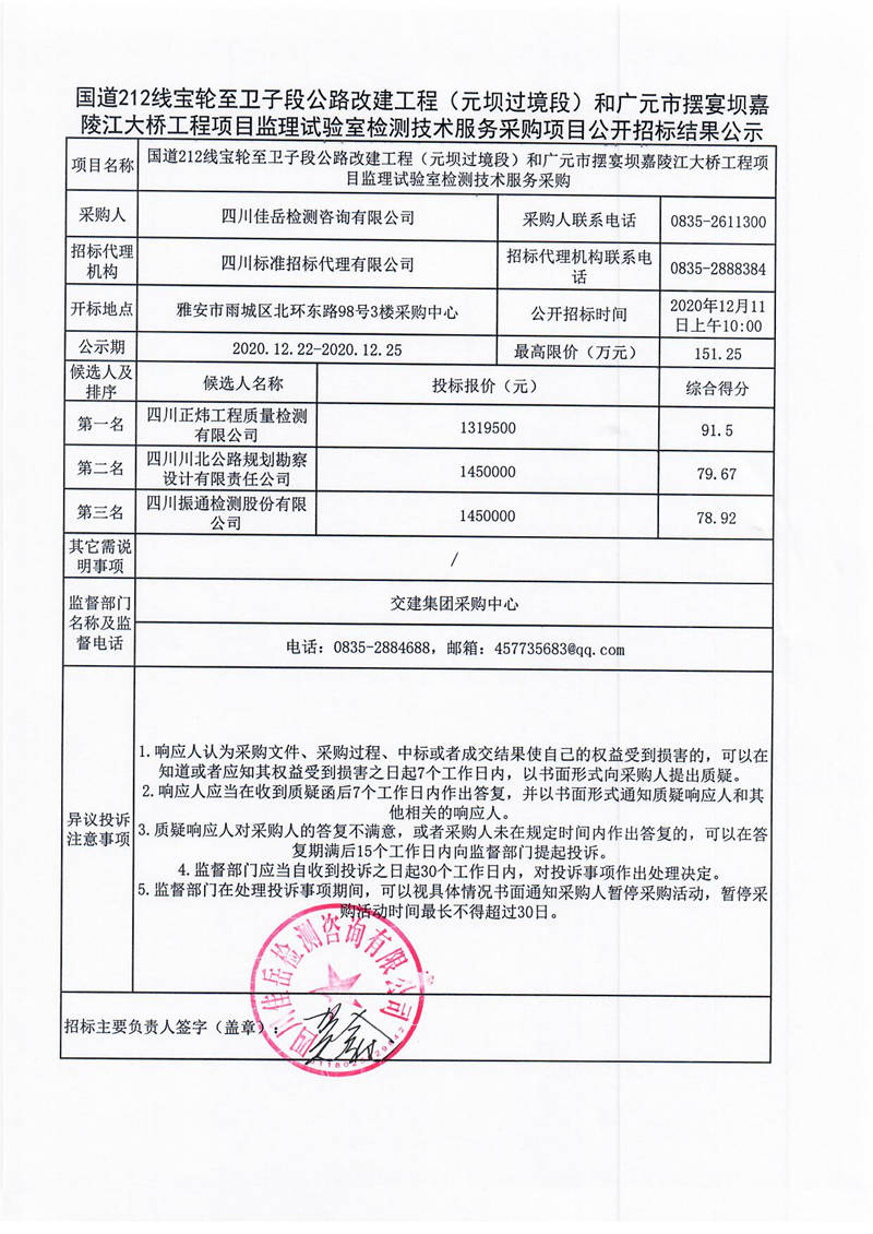 四川佳岳檢測咨詢有限公司國道212線寶輪至衛(wèi)子段公路改建工程(元壩過境段)和廣元市擺宴壩嘉陵江大橋工程項(xiàng)目監(jiān)理試驗(yàn)室檢測技術(shù)服務(wù)采購項(xiàng)目公開招標(biāo)結(jié)果公示
