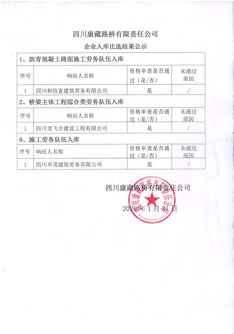 四川康藏路橋有限責任公司企業(yè)入庫比選結(jié)果公示
