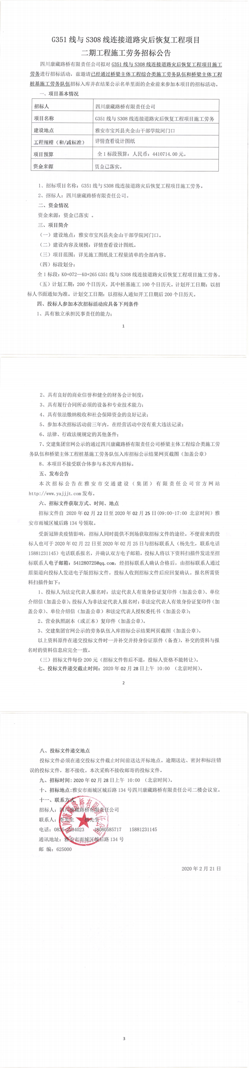 四川康藏路橋有限責任公司G351線與S308線連接道路災(zāi)后恢復(fù)工程項目二期工程施工勞務(wù)招標公告