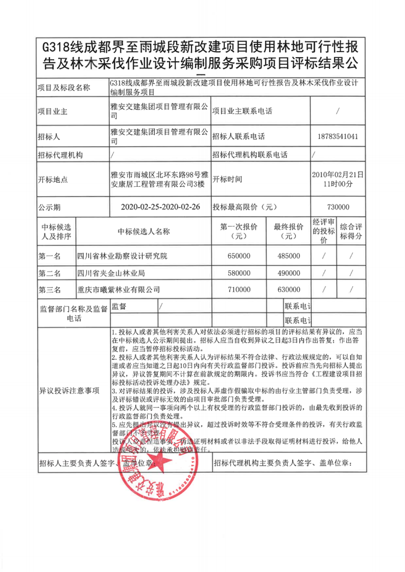 雅安交建集團(tuán)項(xiàng)目管理有限公司G318線成都界至雨城段新改建項(xiàng)目使用林地可行性報(bào)告及林木采伐作業(yè)設(shè)計(jì)編制服務(wù)采購(gòu)項(xiàng)目評(píng)標(biāo)結(jié)果公示