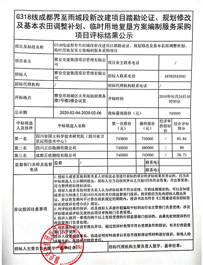 雅安交建集團項目管理有限公司G318線成都界至雨城段新改建項目踏勘論證、規(guī)劃修改及基本農(nóng)田調(diào)整補劃、臨時用地復(fù)墾方案編制服務(wù)采購項目評標結(jié)果公示