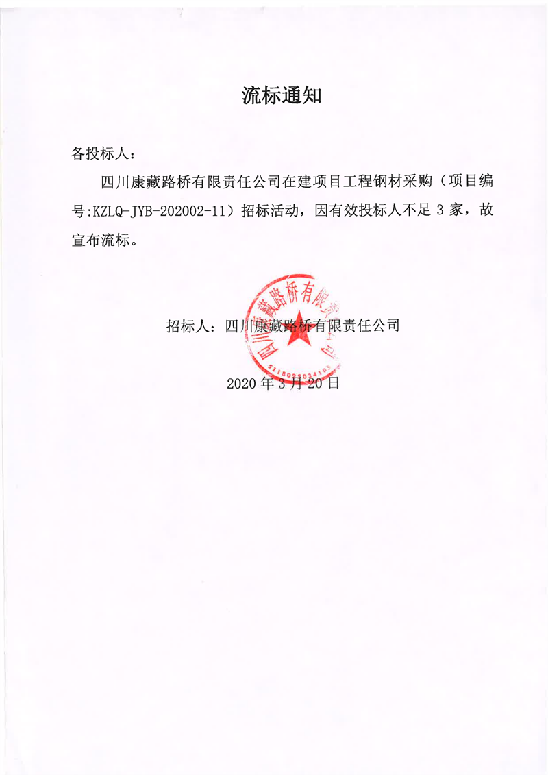 四川康藏路橋有限責(zé)任公司在建項目工程鋼材采購流標(biāo)通知