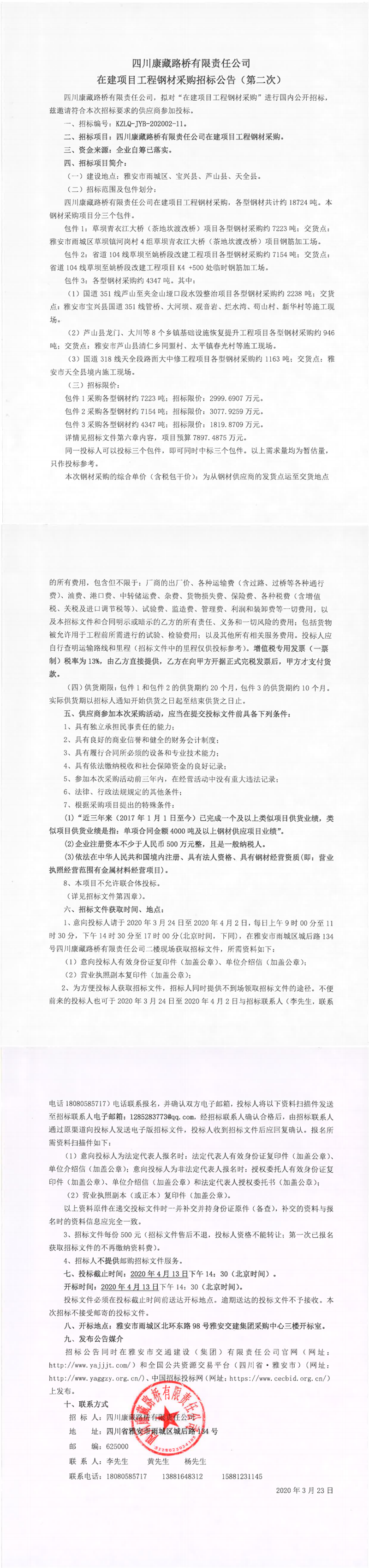 四川康藏路橋有限責(zé)任公司在建項(xiàng)目工程鋼材采購(gòu)招標(biāo)公告(第二次)