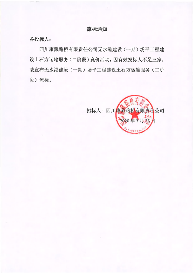四川康藏路橋有限責(zé)任公司無水港建設(shè)(一期)場平工程建設(shè)土石方運輸服務(wù)(二階段)流標通知