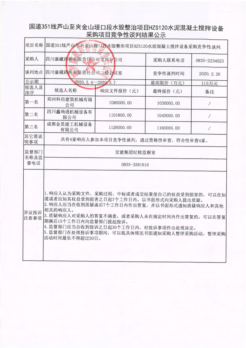 四川康藏路橋有限責(zé)任公司國道351線蘆山至夾金山埡口段水毀整治項目在建工程項目HZS120水泥混凝土攪拌設(shè)備采購項目競爭性談判結(jié)果公示