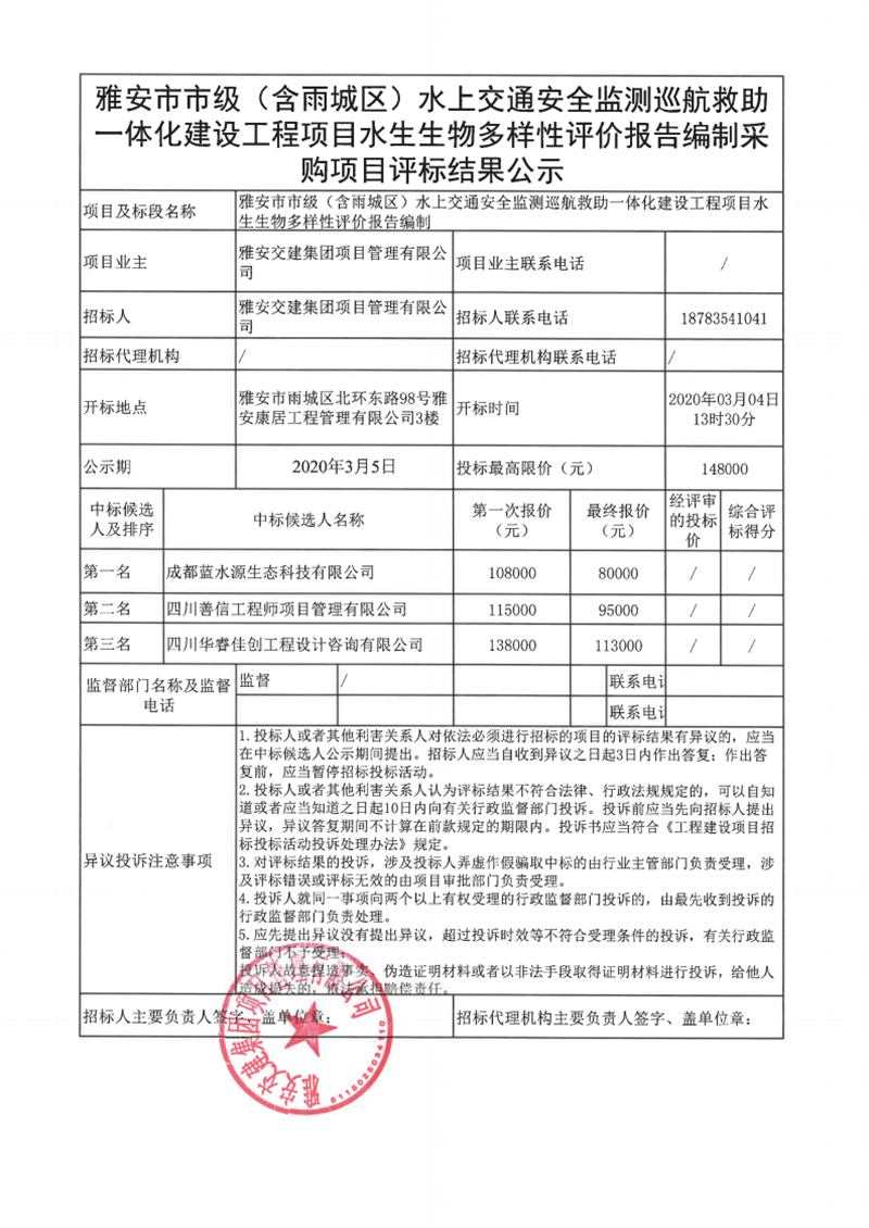 雅安交建集團項目管理有限公司雅安市市級(含雨城區(qū))水上交通安全監(jiān)測巡航救助一體化建設(shè)工程項目水生生物多樣性評價報告編制采購項目評標(biāo)結(jié)果公示