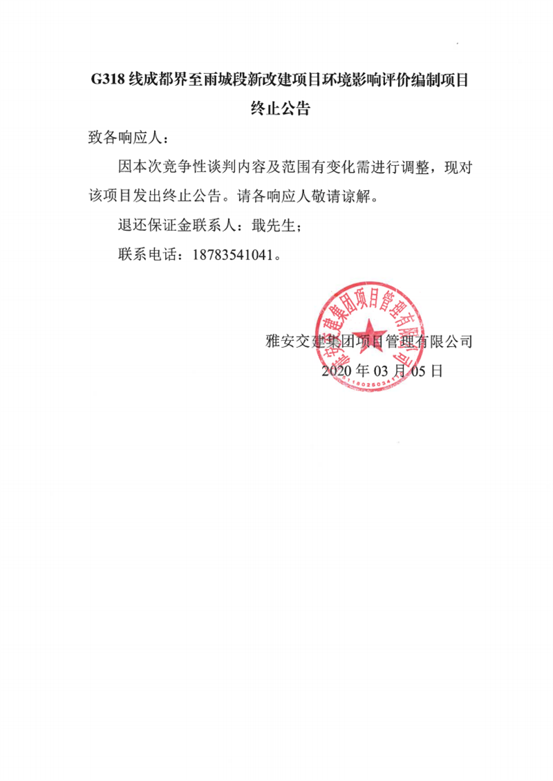 雅安交建集團(tuán)項(xiàng)目管理有限公司G318線成都界至雨城段新改建項(xiàng)目環(huán)境影響評價編制項(xiàng)目終止公告