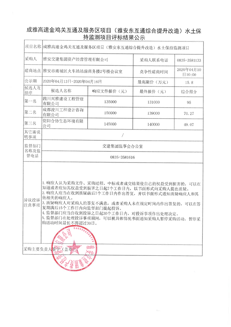 雅安交建集團資產(chǎn)經(jīng)營管理有限公司成雅高速金雞關互通及服務區(qū)項目(雅安東互通綜合提升改造)水土保持監(jiān)測項目評標結果公示