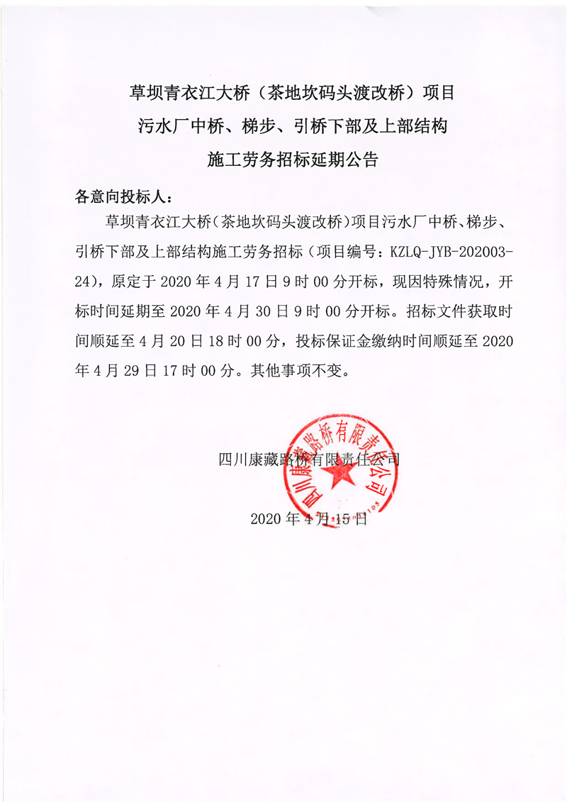 四川康藏路橋有限責(zé)任公司草壩青衣江大橋(茶地坎碼頭渡改橋)項目污水廠中橋、梯步、引橋下部及上部結(jié)構(gòu)施工勞務(wù)招標延期公告