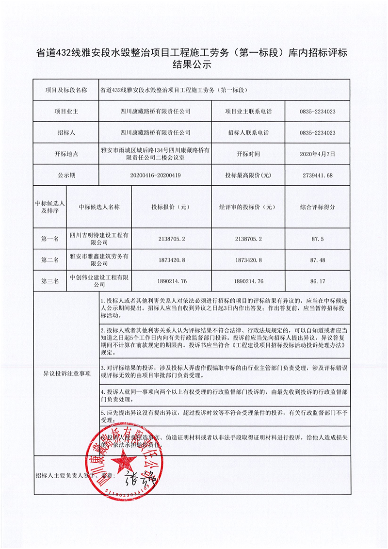 四川康藏路橋有限責(zé)任公司省道432線雅安段水毀整治項(xiàng)目工程施工勞務(wù)(第一標(biāo)段)庫(kù)內(nèi)招標(biāo)評(píng)標(biāo)結(jié)果公示