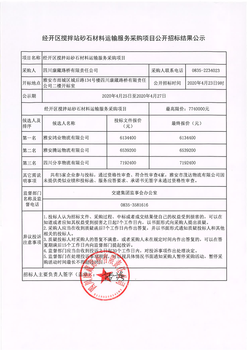 四川康藏路橋有限責(zé)任公司經(jīng)開區(qū)攪拌站砂石材料運(yùn)輸服務(wù)采購項目公開招標(biāo)結(jié)果公示