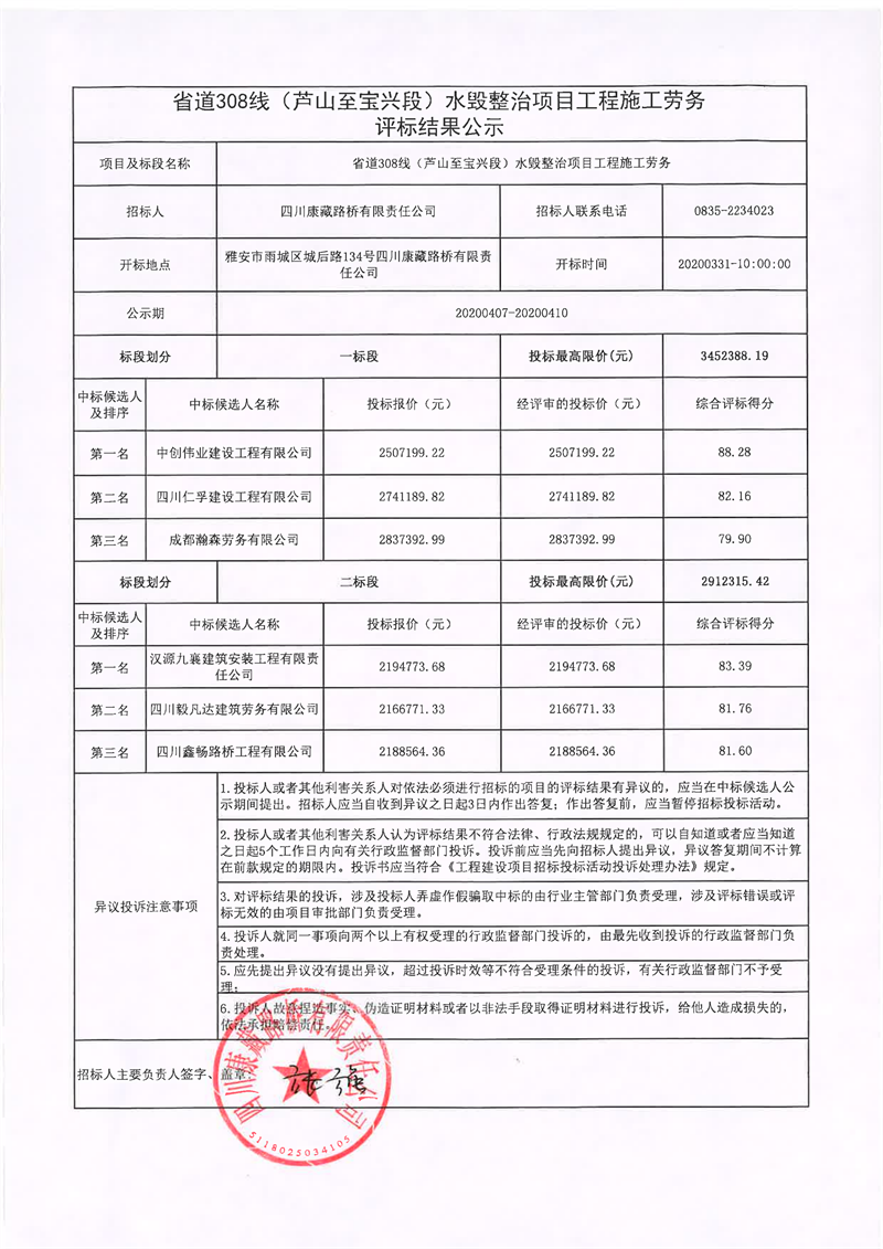 四川康藏路橋有限責(zé)任公司省道308線(蘆山至寶興段)水毀整治項(xiàng)目工程施工勞務(wù)評(píng)標(biāo)結(jié)果公示