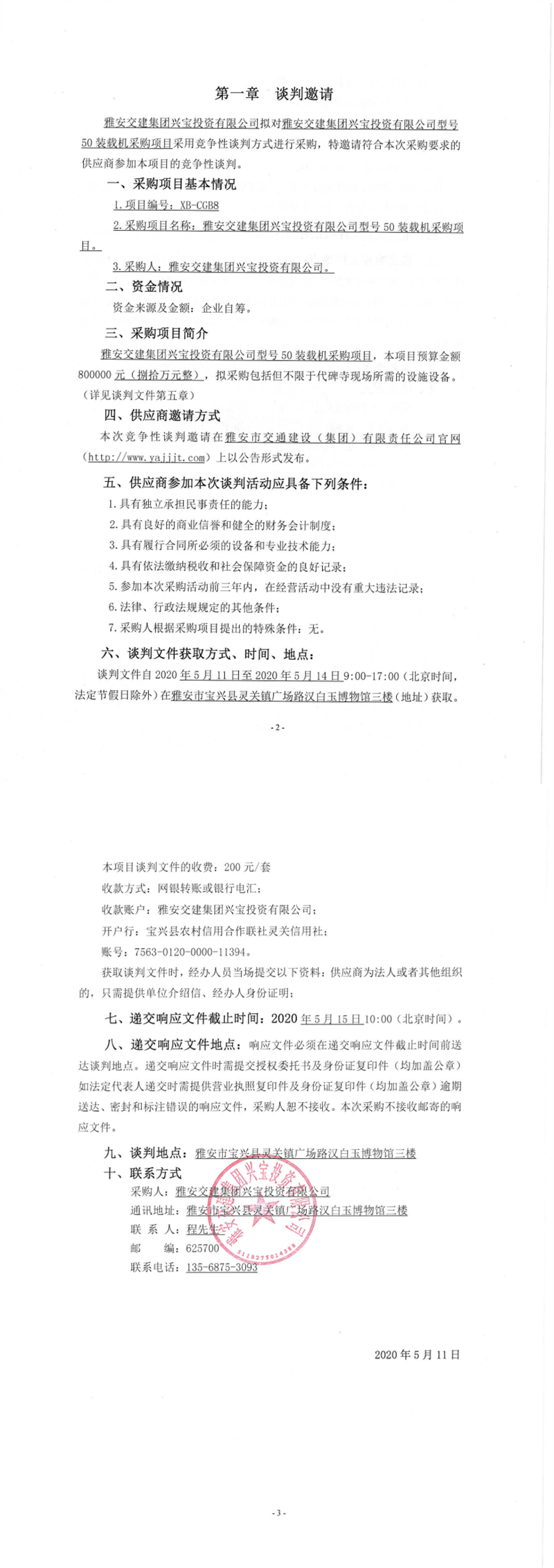 雅安交建集團(tuán)興寶投資有限公司型號(hào)50裝載機(jī)采購(gòu)項(xiàng)目競(jìng)爭(zhēng)性談判公告