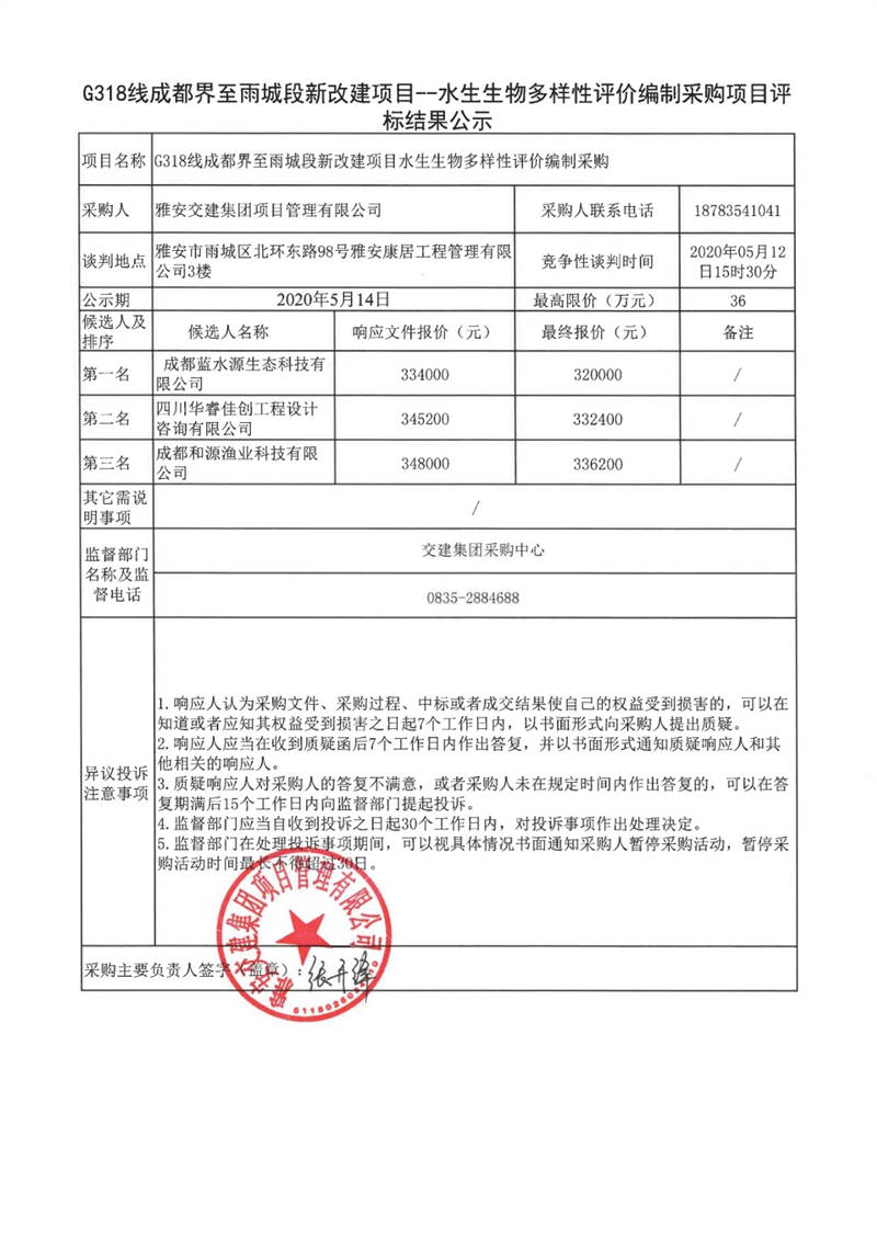 雅安交建集團(tuán)項(xiàng)目管理有限公司G318線成都界至雨城段新改建項(xiàng)目水生生物多樣性評(píng)價(jià)編制采購(gòu)項(xiàng)目評(píng)標(biāo)結(jié)果公示