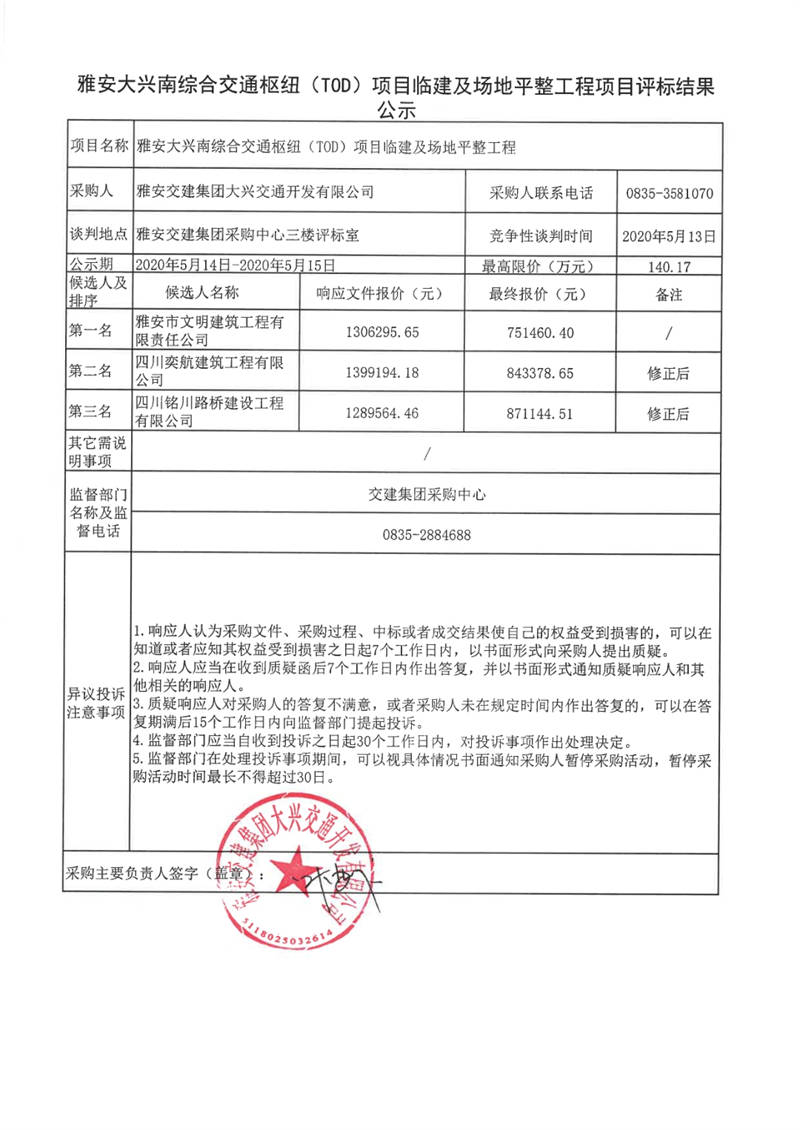 雅安交建集團大興交通開發(fā)有限公司雅安大興南綜合交通樞紐(TOD)項目臨建及場地平整工程項目評標結果公示
